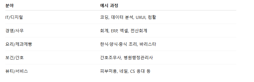 🎀 대부분 NCS 기반 과정으로, 국가자격증 취득 + 취업 연계가 가능한 실질적인 훈련들입니다.