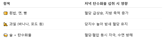 해결 팁 : 저녁 식사는 7시 이전, 단백질 중심 + 저탄수화물 구성이 이상적입니다.